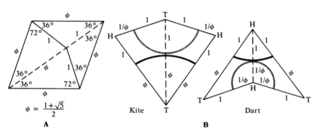 עס איז אינטרעסאנט צו באמערקן אז געוויסע פון די טיילינגס [למשל די אויבערשטע בילד] באנוצן זיך מיט א ראַמבּוס [אזא ״געבויגענע״ סקווער], וואס צוויי פון אירע ענגעלס זענען 108° דעגריס און די אנדערע צוויי 72° דעגריס, וואס מ׳צושניידט זיי אין צו א דאַרט און קייט שׁעיפּס, און עס קומט אויס אז די רעישיאו דערביי איז די גאלדענע רעישיאוי וואס [tag]פארוואס?[/tag] האט מסביר געווען דא בטוטו״ד. מען שניידט עס כזה: