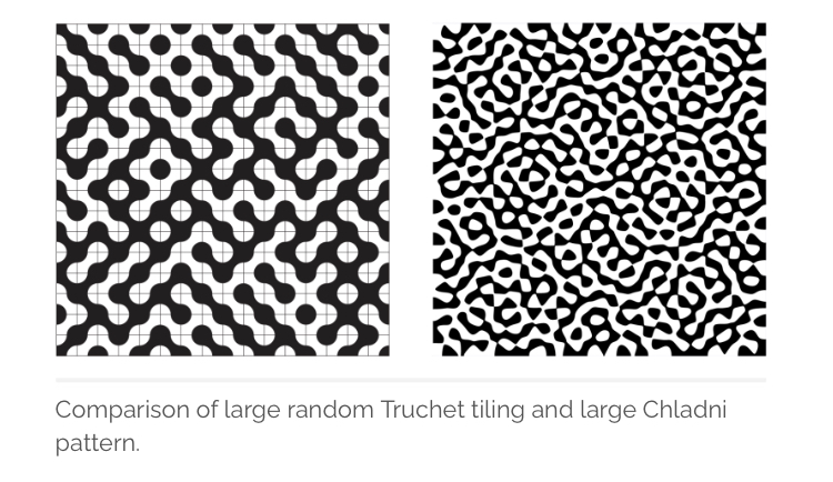 אין acoustics, די שטודיע פון קול, איז דא די געדאנק פון טשלאדני פּלעיטס. דאס איז ווען מען גיסט זאמד אויף א פלאכע אייזן און דערנאך ״שפילט״ מען דאס אזוי ווי א פידל. די זאמד וועט זיך נעמען שאקלען און זיך אויסשטעלן אין (סימעטריקעל) פּעטערנס, וואס וועלן זיין עפ״י די סיניוּסוידעל וועיוו(ס) און שׁעיפּס (שאינם נראים לעינים) וואס די ״שפילן״ מאכט אויפ׳ן פּלעיט. דאס איז עפ״י טשלאדני׳ס געזעץ: