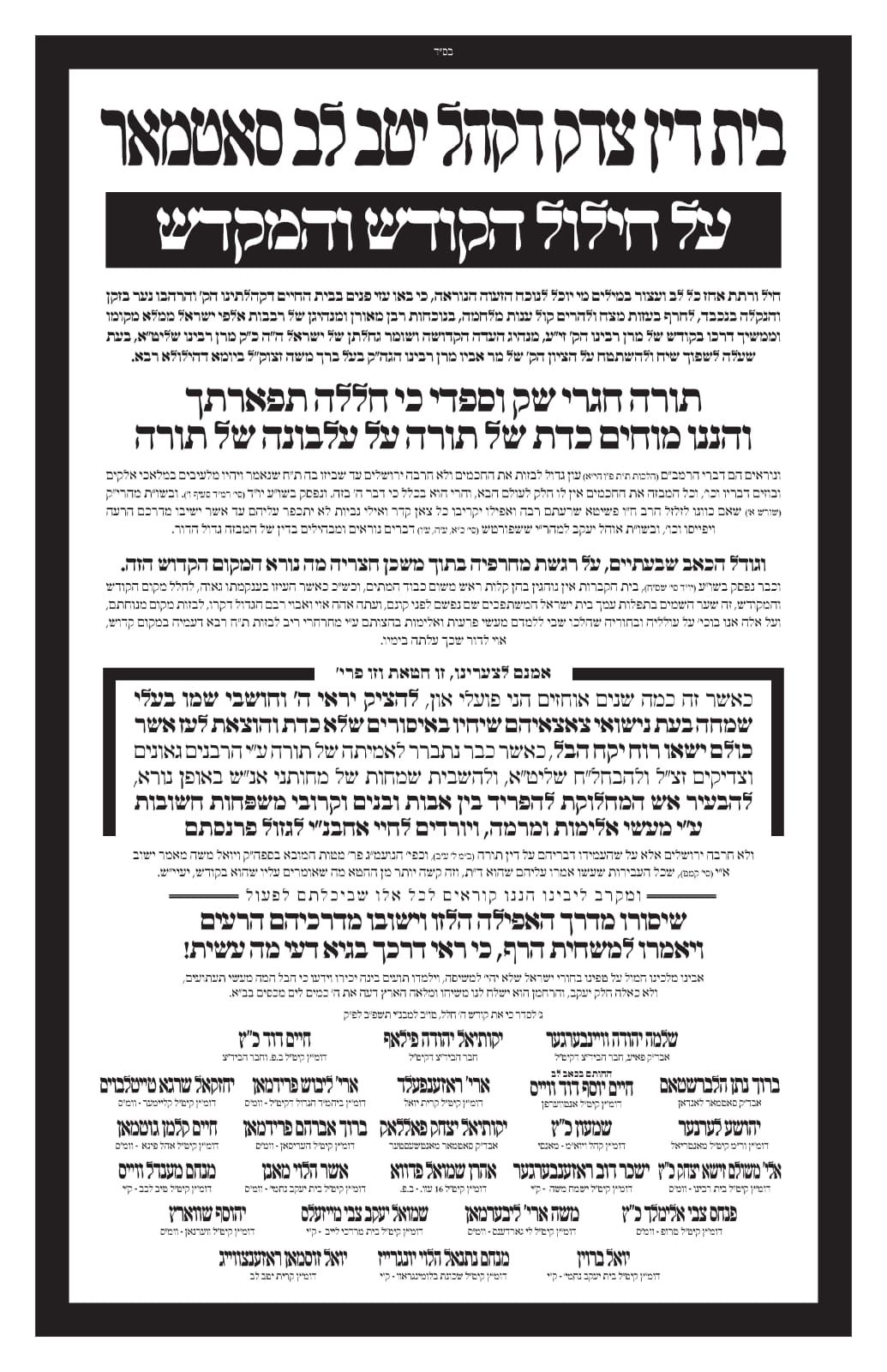 אזעלכע טיטלען צו שרייבן אויף א איש פשוט, רבן ומאורן ומנהיגן של רבבות אלפי ישראל ממלא מקומו וממשיך דרכו של מרן רבינו הק' זי"ע, מנהיג העדה הקדושה ושומר גחלתן של ישראל, תורה תורה חגרי שק, וההני מוחים כדת של תורה על עלבונה של תורה, לא חרבה ירושלים עד שביזו בה ת"ח וכו',