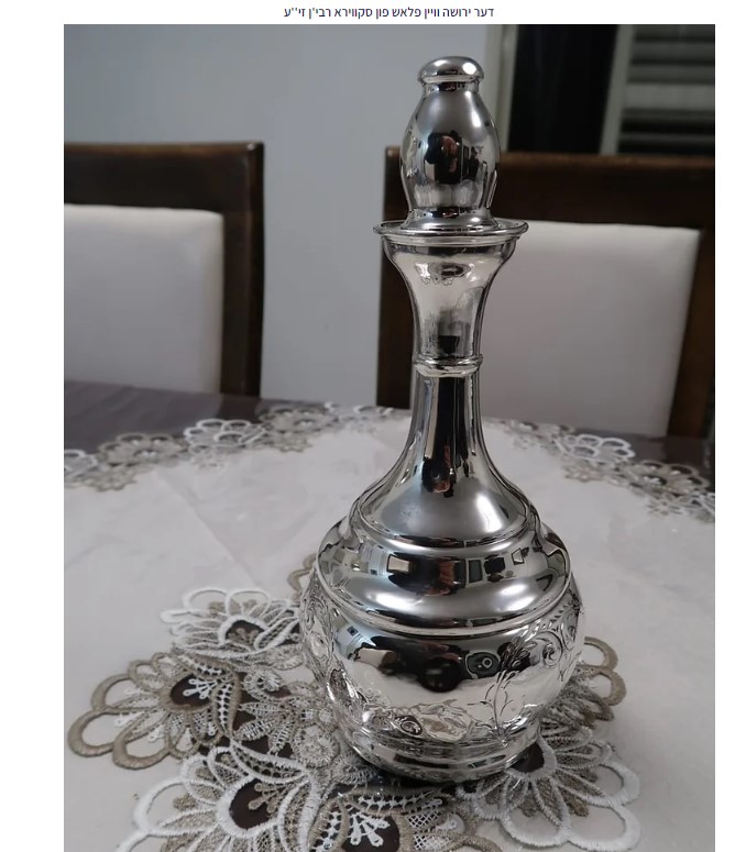 ליין דא פון בחצרות אויף די היסטארישע שריט פונעם רבי'ן וואס האט ארויס געגבן מבית גנזיו א ירושה ווין פלאש צו די עסקנים צו פארוואנדלען פאר בעכערס פאר די נדבנים