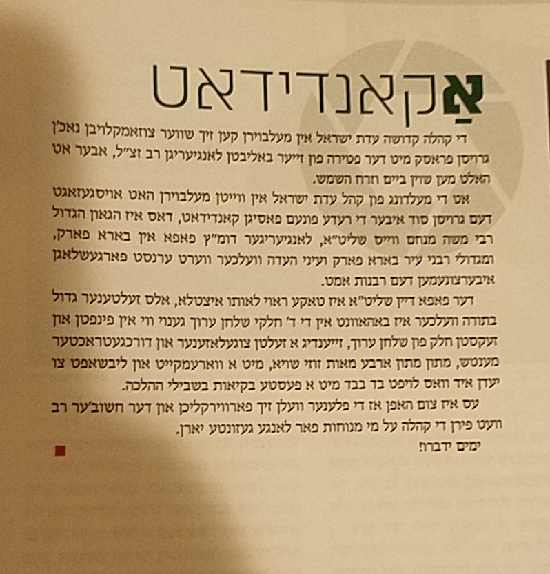 און ווען מ'גייט אויפנעמען א נייעם רב אין א קהילה דארף מען נישט יענעם מבזה זיין און קליין מאכן. אפילו וועם מ'קען נישט. אזוי ווי איך קען הרב משה מנחם ווייס שליט"א. וואס ער איז א גרויסער בעל הוראה. און אן איידעלער יונגערמאן. דארף מען אויכעט פארגינען...!