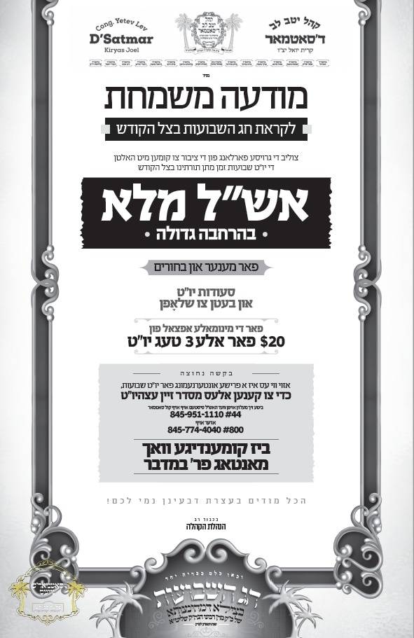סאטמאר ווי אסאך אנדערע גרויסע קהילות איז געסט אויף יום טוב א חלק פין די קאליר וואס די יום טוב גיבט צו, אין קרית יואל פלעגען נאך קומען אין צייט פין ברך משה נאטורליך אסאך געסט אויף שבועות, (אין נאך היינט צו טאגס לייגט מען כמעט יעדע יאר צו פרישע עקסענטשאן'ס צו די שוהל מיט זיצן, אויף היי יאר גייען זיי אויך בויען א נייע גאלערי אין די קוים באנייטע דרום פליגער ווי מ'גייט צולייגן נאך זיצן, אויף וואס מענטשן צאלען שווערע געלטער) ביי מהרז''ל וויל מען ארבייטן עס זאל געשעהן, אבער זיין לאקאל עולם פין וומסב''ג לויפט צו אלע אנדערע רבי'ס אבער כ'גלייב אז די סעודות חלוקה וועט עפעס אויפטוהן צו אנפולן די חלל